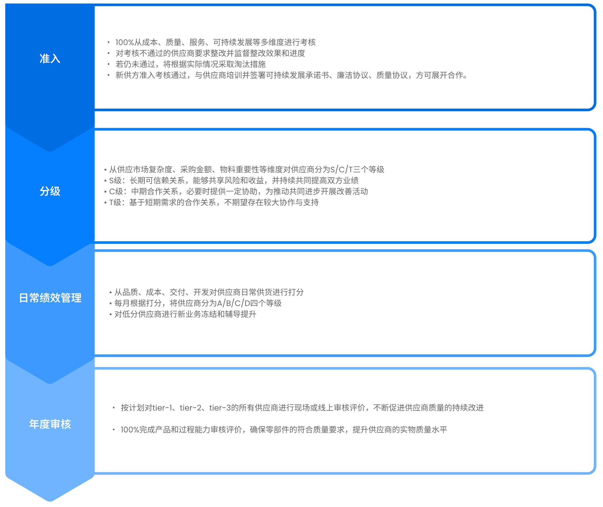 敏實集團遵守運營地所在國法律法規(guī),制定《敏實集團供應商行為準則》《過程審核管理指南》《敏實供應商管理手冊》《采購通則》《供應商風險管理指南》《供應商信息管理指南》和《供應商CSR管理指南》等詳細政策。2024年,我們修訂了《供應商績效管理指南》,將可持續(xù)發(fā)展作為供應商月度績效的新要求。在供應商尋源、準入與淘汰、審核評估、績效評價、溝通交流等各環(huán)節(jié)均設置了嚴格完善的管理流程體系,保障供應鏈全流程全生命周期實現(xiàn)閉環(huán)管理。2023年完成可持續(xù)發(fā)展承諾書發(fā)布,2024年修訂可持續(xù)發(fā)展承諾書,新增支持沖突礦產(chǎn)政策、盡職調(diào)查、溯源調(diào)查、碳排放統(tǒng)計等要求。