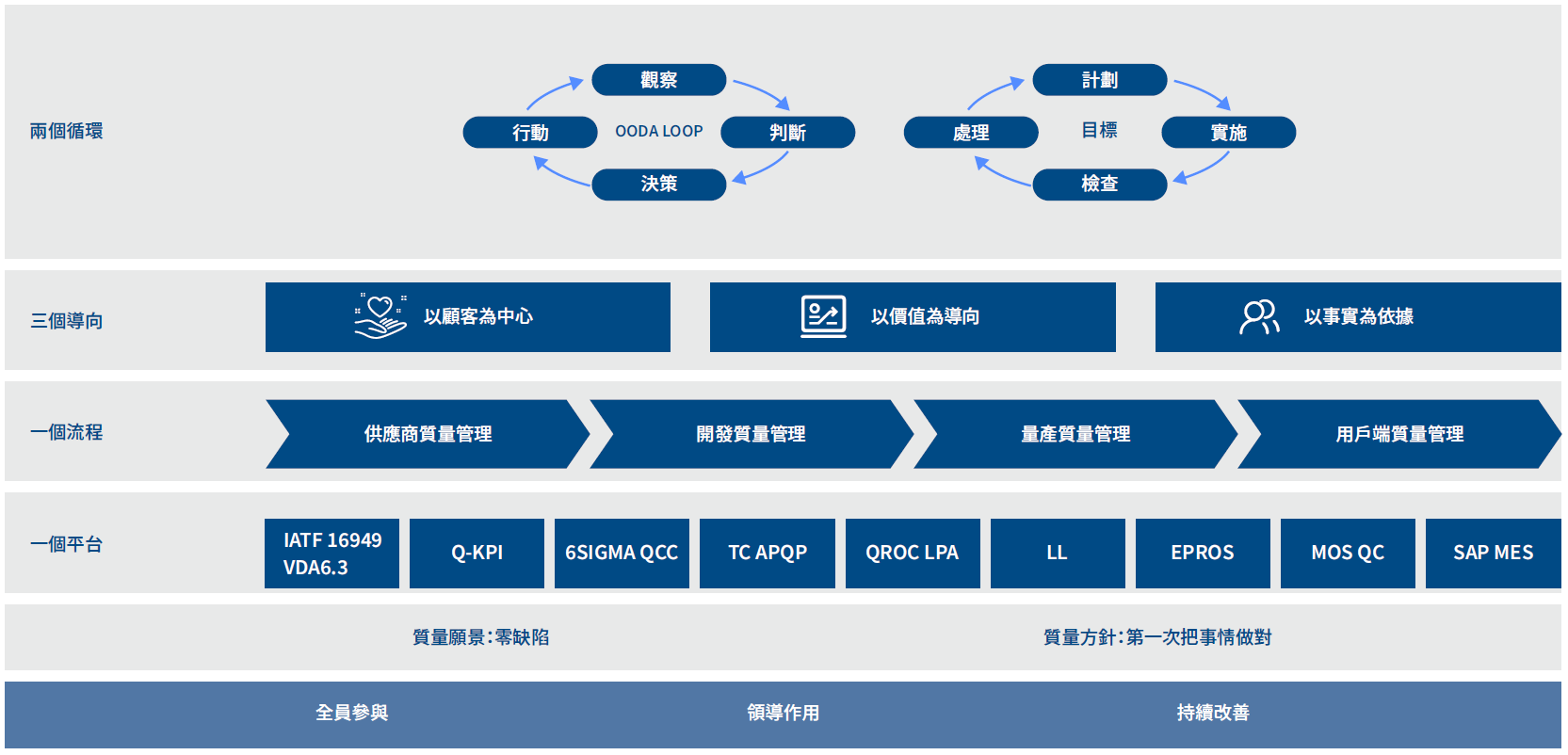 通過6sigma、QCC工具、數(shù)字化手段改善質(zhì)量流程管理,再通過LPA分層審核、VDA6.3過程審核、VDA6.5產(chǎn)品審核等持續(xù)評估質(zhì)量管理體系和流程的有效性,以便為客戶提供最高質(zhì)量的產(chǎn)品、服務和解決問題方案。