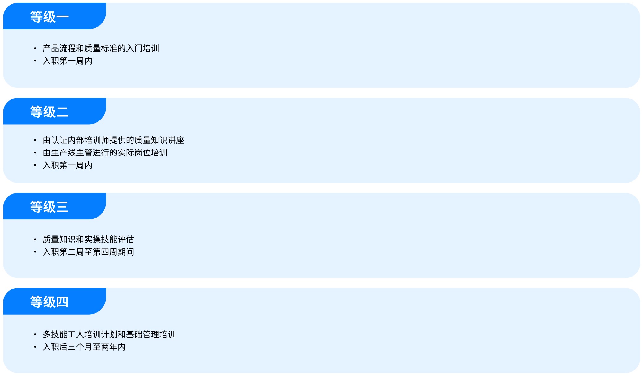 自員工入職之日起,我們?yōu)樗袉T工(包括兼職員工)提供 100% 覆蓋的質(zhì)量意識與技能培訓,作為確保產(chǎn)品質(zhì)量的基礎。在入職后的四周內(nèi),所有員工必須完成前三個等級的質(zhì)量培訓,并通過每一階段的考核。若員工將轉(zhuǎn)為多技能工種,則需完成 四個等級 的培訓要求。